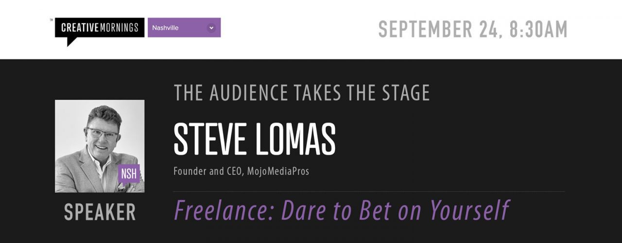 MojoMediaPros’ founder and CEO, Steve Lomas will take the CreativeMorning stage at the Nashville chapter’s September event, “The Audience Takes the Stage. The CreativeMornings theme for the month is “Dare”. Lomas will address the courage and planning it takes to successfully transition to the gig economy in his talk, “Freelance: Dare to Bet on Yourself”. The event is virtual and FREE to attend. You may register here. Save the date: Friday, September 24, 8:30 am.